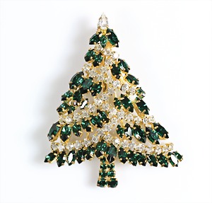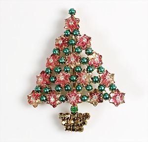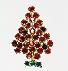 Weihnachtsbaum-Brosche USA 1950/60er Jahre, Metall geschwärzt,signiert: WEISS; grüne Perlen weiße u. rote Strasssteine, ca. 73 x 54 mm