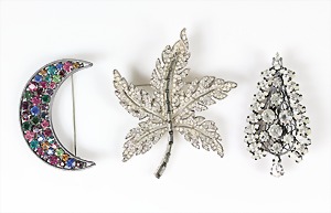 Lot: Weihnachts-Broschen USA 1950/60er Jahre, weißfarben, signiert: WEISS; 1 Blatt, klare (runde) und hellbraune (Baguettes) Strasssteine, ca. 69 x 62mm; 1 Mond, bunte Strasssteine, ca. H = 50,5 mm; 1 Baum,weiße Strasssteine, H = 50,5 mm