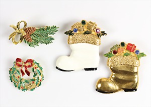 Lot Broschen: "WEIHNACHTSSCHMUCK", goldfarben, Emaillelack, bunter Strass, Stiefel H = 56,5; Kranz D = 38 mm