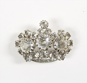 Brosche "KRONE", USA 1950/60er Jahre, weißfarbens Metall, signiert: WEISS; weiße Strasssteine, ca. 53,5 x 52,5 mm, plastisch gearbeitet