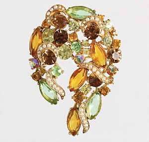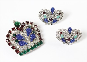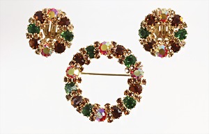 Strass-Set aus Ohrclips und Brosche von WEISS (signiert auf den Clips), USA, Kringelform mit bedampften, schimmernden Strasssteinen in Grün-, Rot- und Brauntönen, Brosche: D = 38 mm, Clips: D = 23,5 mm