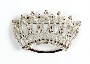 Brosche "KRONE", USA 1950/60er Jahre, weißfarbens Metall, signiert: WEISS; weiße Strasssteine (teilweise im verschnitt), purpur roter Strass als farbakzente, ca. 79,5 x 51 mm, plastisch gearbeitet