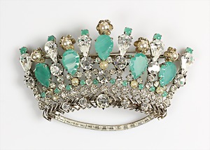 Brosche "KRONE", USA 1950/60er Jahre, weißfarbens Metall, signiert: WEISS; weiße Strasssteine, Kunstperlen, smaragdgrünes Glas, teilwese gestreift/mamoriert, ca. 98,8 x 64,5 mm, plastisch gearbeitet