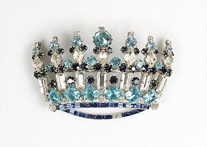 Brosche "KRONE", USA 1950/60er Jahre,weißfarben, signiert: WEISS; dkl. Weißer, aquamarinfarbener u. dkl. blauer Stass, ca. 79 x 54,5 mm