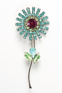 Brosche "BLUME", USA 1950/60er Jahre, weißfarbens Metall, signiert: WEISS; türkis, grüne u.zentraler roter Strassstein/e, blau u.grüne Blütenblätter, ca. 100 x 42,7 mm