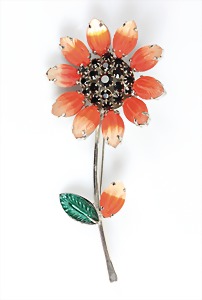 Brosche "BLUME", USA 1950/60er Jahre, weißfarbens Metall, signiert: WEISS; orange/weiß gravierte Blütenblätter umschließen schwarze Strasssteine, 1 grünes graviertes Blatt, ca. 108 x 50 mm