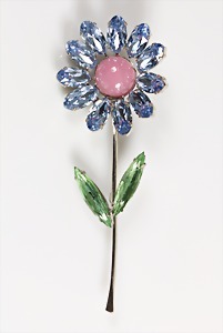 Brosche "BLUME", USA 1950/60er Jahre, weißfarbens Metall, signiert: WEISS; blaue (tolle Brillanz) u.grüne Strasssteine, zentraler Cab. (rosa/lila), ca. 103 x 39 mm (1 Stein fehlt)