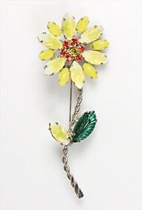 Brosche "BLUME", USA 1950/60er Jahre, weißfarbens Metall, signiert: WEISS; orange u. braune Strasssteine, gelbe Cab., 1 dkl. grünes u. gelb/weiße Blütenblätter, ca. 94,5 x 37 mm
