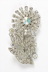 Brosche "BLUME", USA 1950/60er Jahre, weißfarbens Metall, signiert: WEISS; weiße Strasssteine, die 4 größeren opalisierend, ca. 89 x 46 mm (an der Sischerung fehlt Deckelchen, läßt sich trotzdem Öffnen u. Schließen !)
