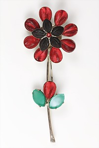 Brosche "BLUME", USA 1950/60er Jahre, weißfarbens Metall, signiert: WEISS; rot, schwarz u. grün gravierte Strasssteine, ca. 112,3 x 45 mm