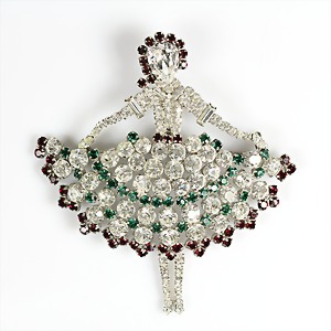 Brosche "TÄNZERIN", PRICHARÉ Kaufbeuren Neu Gablonz 1950/60er Jahre, weißfarbens Metall, signiert: PCH; weißer grüner u. granatfarbene Strasssteine, ca. 95 x 87,8 mm