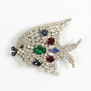 Brosche "FISCH", PRICHARÉ Kaufbeuren Neu Gablonz 1950/60er Jahre, weißfarbens Metall, signiert: PCH; weiße Strasssteine mit blau, rot u. grünem Strass akzentuiert ca. 65 x 68,2 mm