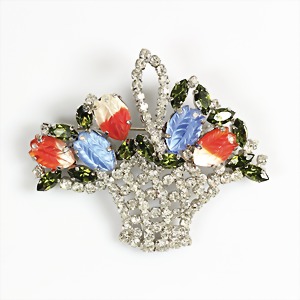 Brosche von DIOR, "BLUMENKORB", 1950/60er Jahre, weißfarbens Metall, signiert: Chr. Dior 66 GERMANY; bunte gravierte Blätter (mit kl. weißen Strasssteinen), weißer u. grüner Strass, ca. 63,5 x 74,8 mm