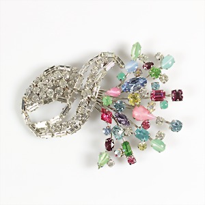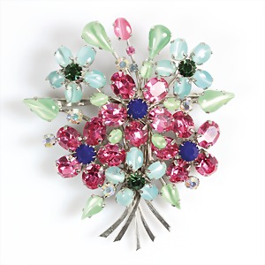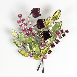 Brosche "BLUMENSTRAUß", USA 1950/60er Jahre, weißfarbenes Metall, signiert: WEISS; rosa Strass, zartgrün graviertes, granatfarbenes Spiegelglas, ca. 74,3 x 61 mm, (1 bl. Stein fehlt)