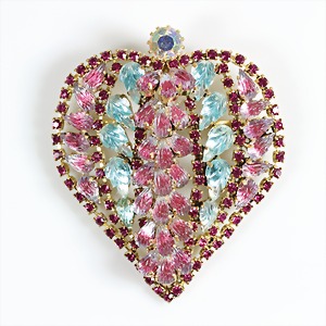 große Brosche "Herz", PRICHARE Kaufbeuren Neu-Gablonz 1950/60er Jahre, goldfarben, signiert: PCH; rot/pinkfarbener Strass mit gravierten Blättern in blau u. rot, 1 opalisierender Strassstein, ca. 90 x77 mm