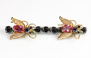 Brosche, PRICHARÉ Kaufbeuren Neu-Gablonz 1950/60er Jahre, weiß u. goldfarbenes Metall, signiert: PCH, auf einem Steg mit schwarzenen Strasssteinen besetzt sind, sitzten 2 Insekten mit schillernd gravierten Flügeln u. rosafarbenen Glaskörpern, rote Augen runden das Ganze ab, 88,8 x 25,5 mm, ausgefallen !