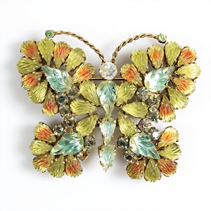 Brosche "SCHMETTERLING", USA 1950/60er Jahre, goldfarben, signiert: WEISS; grün, gelb u. orange schillernde gravierte Blätter, ca. 67 x 57 mm