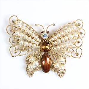 große Brosche "SCHMETTERLING", PRICHARÉ Kaufbeuren Neu-Gablonz 1950/60er Jahre, goldfarbenes Metall, signiert: PCH, 22 aufgereihte Kunstperlen, opalisierende Strasssteine, den Körper bilden ein braun marmorierter Cab. u. 1 brauner Glasstein, 2 rote Augen ca. 96,5 x 72 mm