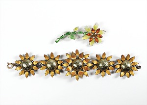 Armband, "SONNENBLUMEN", 1950/60er Jahre, bronciertes Metall, nicht signiert, PRICHARÉ Kaufbeuren Neu-Gablonz ???; strukturierter Glascabochons umgeben von leuchtend gelb gravierten Blättern, Federring, L = ca. 20,5 - 21 cm; kl. Blume, orange u. grünes Glas, gravierte Blätter in gelb-u.grüntönen, L = 79 mm, unsig.