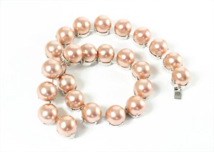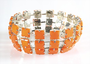 Armband: "PRICHARE Kaufbeuren Neu-Gablonz 1950/60er Jahre, weißfarben, signiert: PCH, orangefarbenes opakes Glas, 3- reihig angeordnet, untergebautes Kastenschloß, L = 18,5 cm;