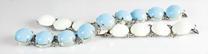 Lot Armbänder: "PRICHARE Kaufbeuren Neu-Gablonz 1950/60er Jahre, weißfarben, signiert: PCH, beide mit untergebautes Kastenschloß, 1 x Band mit 8 weißfarb. flache Cab. D = ca. 19,5 mm, L = 17 cm; 1 x Band mit 9 türkisfarb. hochgeschliffene Cab. D = ca. 17,5 mm (1 Cab. mit kl. Chip), L = 19,5 cm