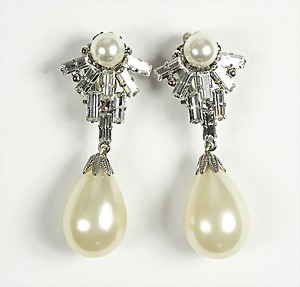 Ohrhänger, "KLASSIKER", Deutschland der 1950/60er Jahre, Metall, sig,: W.GERMANY, weiße Strassbaguettes mit Kunstperle, den Abschluß bilden dekorative Perltropfen, H = ca. 53 mm, (als Clip gearbeitet)