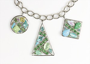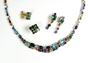 Lot: 1 Halscollier, "FEUERWERK", Frankreich 1950/60er Jahre, weißfarbenes Metall, signiert: Vendome; aneinander gereihte farbenprächtige Glassteine in intensiven Farbtönen, nach hinten verjüngend, L = ca. 41,5 cm; 1 Paar Ohrclips/Hänger, PRICHARE Kaufbeuren Neu-Gablonz 1950/60er Jahre, weißfarben, signiert: PCH, bunte Strasssteine, H = 47 mm; 1 Paar Manschettenknöpfe, PRICHARE Kaufbeuren Neu-Gablonz 1950/60er Jahre, goldfarben, signiert: PCM, grüne Strasssteine, ca. 19 x 19,5 mm