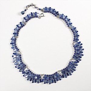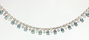Collier PRICHARE Kaufbeuren Neu-Gablonz 1950/60er Jahre, weißfarben, signiert: PCH; hell.- u. dkl. blauer Strass, 1 Kunstperle, L = ca. 38 - 42 cm, vorne H = 20,5 mm