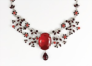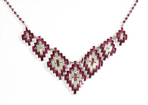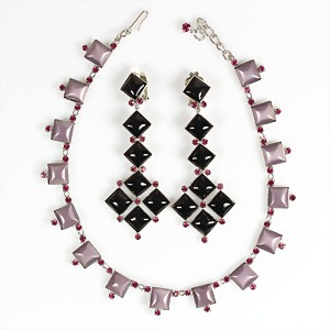 Lot: PRICHARE Kaufbeuren Neu-Gablonz 1950/60er Jahre, weißfarben, signiert: PCH; 1 Collier, rot/pinkfarbener Strass mit brombeerfarbenen, opaken Cab., L = ca. 38 cm; 1 Paar passende Ohrhänger (Clips), H = 83 mm