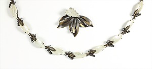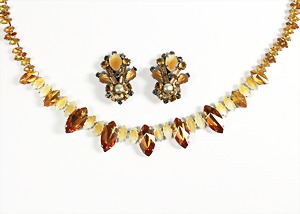 Lot: USA 1950/60er Jahre, weißfarben, signiert: WEISS, 1 Collier, citrinfarbene fac. Glas in Navetteform, dazwischen gravierte Blätter in gelben Farbtönen, L = 42 cm, vorne H = 27 mm; passende Ohrclips von PRICHARE Kaufbeuren Neu-Gablonz 1950/60er Jahre mit citrinfarbenem Glas u. einer Perle, H = 44