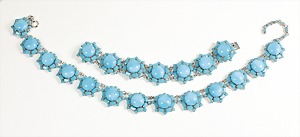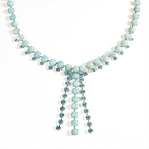 Collier PRICHARE Kaufbeuren Neu-Gablonz 1950/60er Jahre, weißfarben, signiert: PCH; türkisfarbene opake Cab. werden von aquamarinfarbenem Strass begleitet, L = ca. 45 cm, vorne H = 93,5 mm