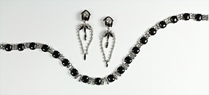 Prunkvolles Collier, USA der 1950/60er Jahre, weißfarbenes Metall, signiert: WEISS, schwarze Glasssteine im Cabochonschliff teilweise facettiert, S-Haken, vordere Höhe 12,0 cm, L = 42 - 44 cm