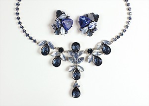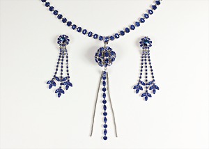 Lot: 1 Collier u. 1 Paar Ohrhänger, "BLAUES WUNDER", PRICHARE Kaufbeuren Neu-Gablonz 1950/60er Jahre, weißes Metall, signiert: PCH W, GERMANY; 1 Collier, blaue Strasssteine, Kugel mit Hängern, L = 43 cm, vorne H = 16,5 cm; 1 Paar Ohrclips/Hänger; blaue Strasssteine, ca. H = 10 cm
