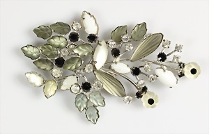 Brosche, USA 1950/60er Jahre, weißfarbenes Metall, signiert: WEISS; weißer-u. schwarzer Strass, grünlich-u.weißes, matt graviertes Glas, weiße opake Cab., 89 x 56 mm
