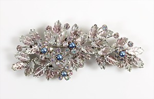 Brosche, "WINTERZAUBER" USA 1950/60er Jahre, weißfarbenes Metall, signiert: WEISS, zartfarbene rosa/bläulicher Strasss, Kunstperlen, gravierte Blätter, ca. 112,5 x 51,5 mm