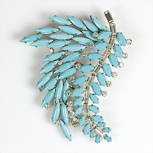 Brosche "WINTERZAUBER", USA 1950/60er Jahre, weißfarbenes Metall, signiert: WEISS; weißfarbener Strass umgeben von geschliffenem, türkisfarbenen opakem Glas, 80,5 x 66,5 mm