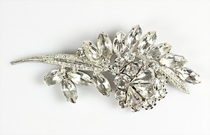 Brosche, "WINTERZAUBER" USA 1950/60er Jahre, weißfarbenes Metall, signiert: WEISS, runde ,navette-u. tropfenförmige weiße Strassteine, ca. 100 x 47,5 mm