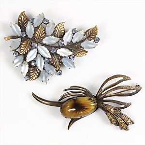 Lot: PRICHARE Kaufbeuren Neu-Gablonz 1950/60er Jahre, bronciertes Metall, signiert: PCH, 1 Brosche mit zartfarbenem lila Strass u. weiße gravierte Blätter L = 80 mm; 1 Brosche mit bräunlichem Cab. u. citrinfarbenem Strass, L = 92 mm