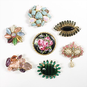 Lot: 2 Broschen 1950/60er Jahre, goldfarbenes Metall, signiert: MADE IN WEST GERMANY (wohl in Neu-Gablonz gefertigt ! ), 1 Brosche, bunte Blüte D = 49 mm; 1 Brosche, unterschiedlich geprägte Steine u. irisierender Strass, 64 x 41,5 mm; außerdem 5 Broschen, goldfarbenes Metall, unsigniert: 1 Brosche, grünes Oval mit Navettenkranz; 1 Brosche schwarzes Navette mit Baguettes; 1 Brosche mit türkisfarbenen Glassteinen; 1 Brosche mit 3 Kunstperlen, opalisierender Strass u. weiß-rosa gravierten Blättern; 1 Brosche Porzellan mit Rosenmotiv D = 55 mm