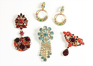 Lot Broschen mit Hängern:, Metall goldfarben, 1 x weißer u. hellblauer Strass, H = 86,5 mm; 1 x rot, orangefarbener Strass, H = 92 mm, 1 x roter Strass u. Cabochons mit 2 Kunstperlen, H = 57,5 mm; Ohrhänger mit farbigem Strass (Clip), H = 50 mm