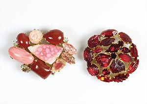 Lot Broschen: USA 1950/60er Jahre, signiert: WEISS, gelbfarbenes Metall, 1 x rote gravierte Blätter u.rote Strasssteine, eine zentrale Blüte, D = 47,5 mm; 1 x unterschiedlich geprägte Steine aus teilweise irisierendem Strass, diverse Cab. 59 x 43,5 mm