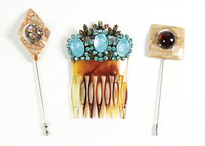 Lot: PRICHARE Kaufbeuren Neu-Gablonz 1950/60er Jahre, schwarz u.weiße Farben, signiert: PCH; 1 Haarkamm, blaue gravierte Steine (oval), bl. Strass, grünbraun changierende Navetten, H = 94,5 mm (2 bl. Steine fehlen); 2 Nadeln mit Perlmutter, je 1 Cabochon, H = 10,5 cm u. 12,3 cm