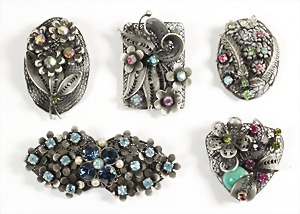 Lot: 5 Broschen, schwarzfarbenes Metall, Blütenmotive mit farbigem Strass u. 1 grüner Cabochon, 4 Kunstperlen, L = 32,5 - 78 mm
