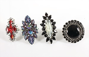 Lot: 3 Ringe, PRICHARE Kaufbeuren Neu-Gablonz 1950/60er Jahre, weißfarben, signiert: PCH; 1 Ring, mit anthrazit-metallisch u. orangerotem Strass; 1 Ring, dkl. Strassteine mit 1 Navette; 1 Ring mit schillernden Blättern, RW ca. 53,5 - 55,5, (noch leicht veränderbar !)