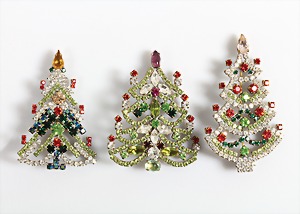 Lot Broschen: 3 "TANNENBÄUME", Metall: gelb/weiß/kupferfarben, weißer/roter/grüner u. blauer Strass mit farblichen Akzenten, H = 62 - 70 mm
