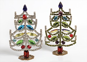 Lot Weihnachtsschmuck: "TANNENBÄUME", Metall: gelb/weiß/kupferfarben, weißer u. blauer Strass, Glas in Oval-u. Navetteform in rot,grün,blau u. gelben Farben, die Spitze bildet ein blauvioletter Tropfen, H = 10,4 cm, (mit Standfuß)