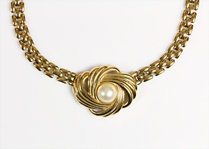 Collier aus den 1980er Jahren der Fa. "LANVIN", signiert: LANVIN GERMANY, goldfarben mit zentraler Kunst-Perle, durch Verlängerungskettchen in der Länge variabel, Karabiner, L = 42,0 - 46,0 cm