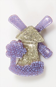 Brosche, "Windmühle" von Lea Stein, sig: LEA STEIN PARIS, aus laminiertem Cellulose-Acetat, Broschierung: Metall, sehr guter Zustand, L = 96,5 mm, Lea Stein wurde stark vom ART-DECO beeinflußt