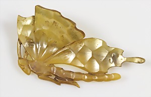 Jugendstil-Brosche um 1900, Horn in Form einer fliegenden HEUSCHRECKE, schillernde Oberfläche, Broschierung: Metall, ca. 64 x 34 mm