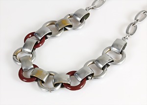 Kette "ART-DECO" Bengel Idar-Oberstein, weißes Metall mit Drehschließe, auberginefarbene Kreise, L = 43 cm (berieben)